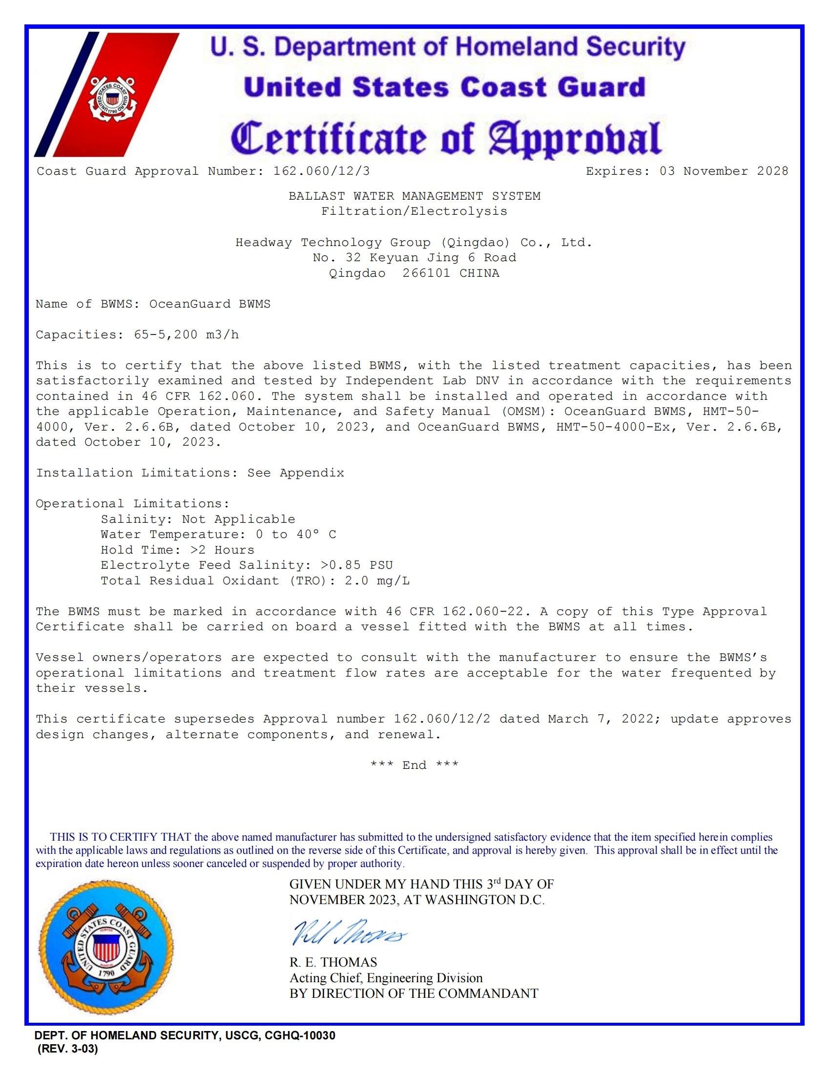 IMO BWMS Code 型式認可證書