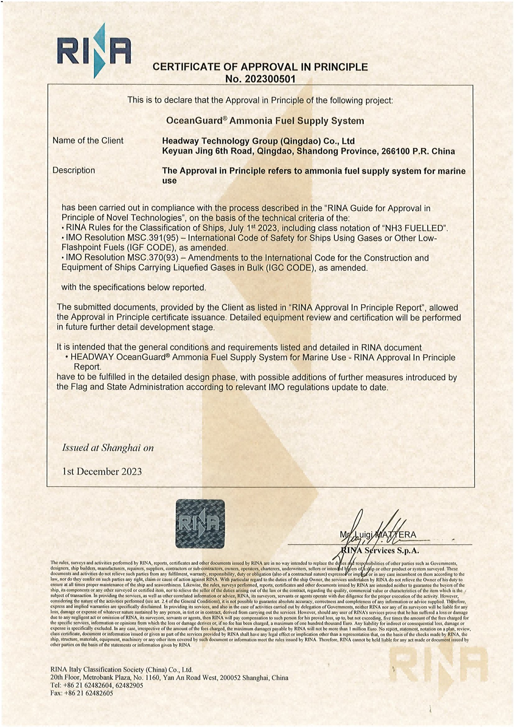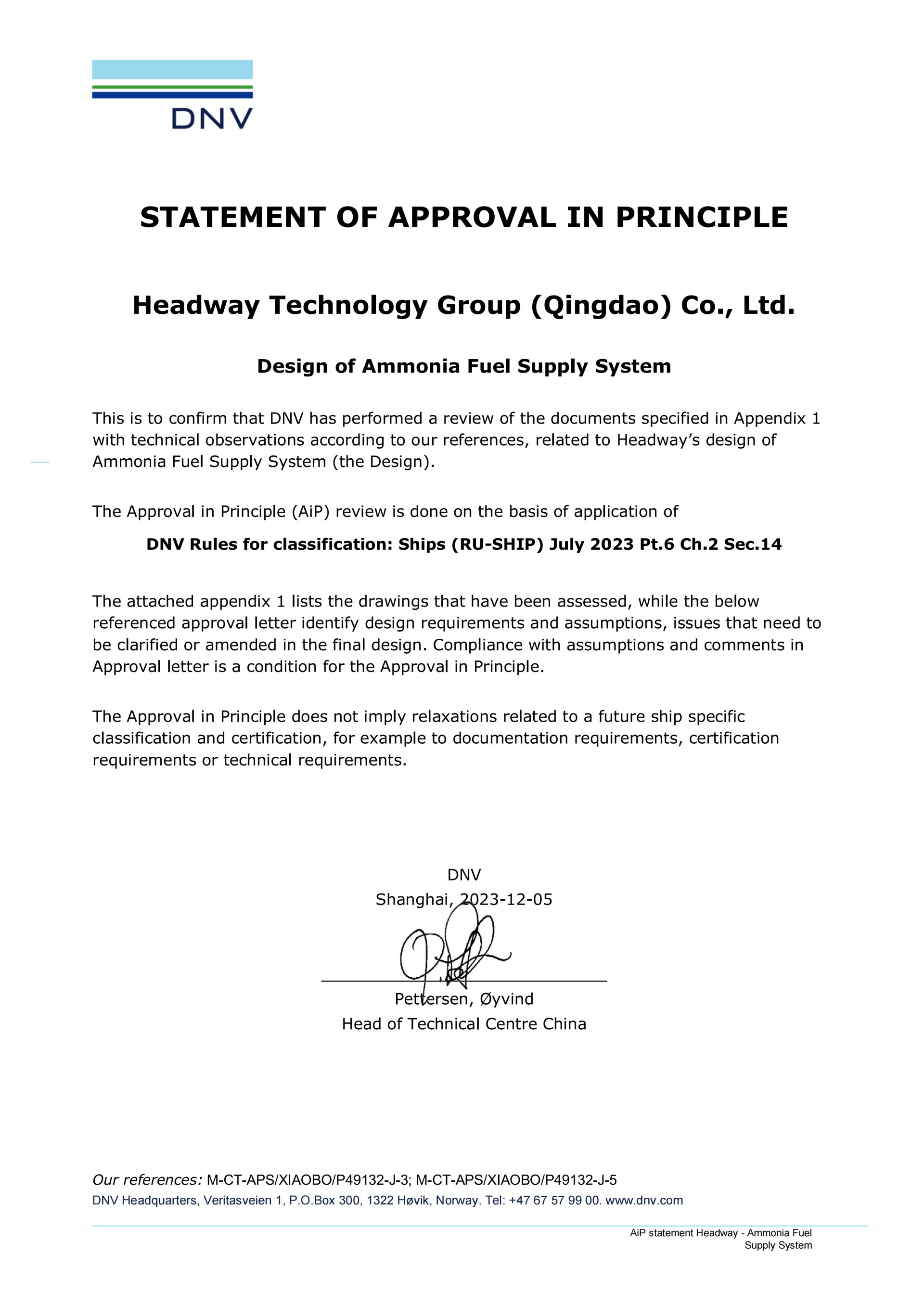 2023年中國國際海事會(huì)展上,海洋衛(wèi)士?氨燃料供給系統(tǒng)正式取得DNV船級(jí)社和RINA船級(jí)社授予的原理認(rèn)可證書,標(biāo)志著海德威低碳航運(yùn)產(chǎn)品生態(tài)再度擴(kuò)軍并取得業(yè)界權(quán)威認(rèn)可。